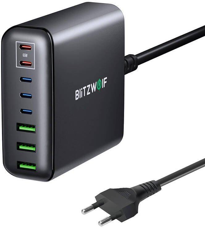 Blitzwolf BW-S26 250W mains charger (black)The BlitzWolf BW-S26 is a mains charger compatible with a wide range of devices including laptops, smartphones and tablets. Thanks to GaN technology, the charger is efficient and compact, offering high power output while maintaining a small size. What's more, it offers up to 8 ports, allowing you to charge multiple devices simultaneously.Multi-level protection and smart chargingThe BlitzWolf BW-S26 charger is equipped with multi-level security features to protect your equipment from damage. What's more, smart technology adjusts charging parameters to the specific device, ensuring optimal performance and safety.Support for fast charging protocolsBW-S26 supports the latest fast charging protocols, such as PD3.0, QC3.0, PPS, AFC, FCP and APPLE. This allows users to enjoy fast charging for a wide range of devices. The charger is also compatible with smartphones, laptops, TWS handsets, Nintendo Switch, powerbanks, tablets, etc., making it a versatile solution for home and office.GaN technologyGaN technology used in the BlitzWolf BW-S26 charger allows the charger to be smaller and more efficient. This makes the device more compact, lighter (it weighs just 268g) and more efficient in operation, making it an ideal choice for both home and travel use. ManufacturerBlitzwolfModelBW-S26ColorBlackWeight268 gInterfacex3 USB-A+ x5 USB-CInput voltageAC 100-240V (50Hz/60Hz)Output voltageUSB-C1/USB-C2: 20V/3.25A; USB-C3/USB-C4: 15V/3.0A; USB-C5: 5V/3A; USB-A1/A2/A3: 5V/3ATotal output power250 WSupport for fast charging protocolsPD3.0 QC3.0 AFC FCP PPS APPLE