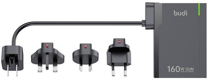 Budi 350 GaN PD+ QC3.0 160W US/UK/EU Black Wall Charger Looking for a versatile and efficient wall charger? Introducing the Budi 350, which combines many features to meet your needs. It is compatible with various types of devices and supports fast PD charging. Furthermore, it has a conveniently coiled cable inside, making it an ideal choice for travelers who will also appreciate the various types of adapters included. Universal Compatibility The Budi 350 charger is compatible with all types of devices, which means you can charge your smartphones, tablets, laptops, and more without any problems. You don't have to worry whether you are using Apple, Android, or another manufacturer's devices. Fast PD Charging Thanks to Power Delivery (PD) fast charging technology, the Budi 350 charger allows you to quickly charge your device. You'll get full power without unnecessary waiting, which is incredibly convenient, especially when you're in a hurry. Integrated Cable One of the most practical features of this charger is the coiled cable inside the device. You can extend and retract it as needed, eliminating tangled cables and making it even easier to use the charger. Adapter Set This is a real treat for travelers. In the package, you will find adapters for American, British, European, and Australian sockets, which means that no matter where you are in the world, you will always have the right plug for charging. Powerful Performance The Budi 350 charger offers an impressive 160W of power, allowing you to quickly charge multiple devices. The Budi 350 wall charger is the perfect combination of universal compatibility, fast charging, a practical cable, adapter set, and powerful performance. With it, you can enjoy easy and efficient charging anywhere in the world. Package Includes Charger x 1 American Socket Adapter x 1 British Socket Adapter x 1 European Socket Adapter x 1 Australian Socket Adapter x 1 Specifications Brand Budi Model 350 Color Black Power 160W Technology GaN Number of Ports6 Interface 5 x USB-C, 1 x USB-A Input 200-240V~AC 2A 50/60Hz USB-C1 Output 5V/9V/12V/15-3A, 20V - 5A PPS: 3.3V-20V 5AUSB-C2/C3/C4 Output 5V/9A/12V/15/20V - 1.67APPS: 3.3V-20V 3A USB-C5 Output5V - 3A, 9V - 2.22A, 12V - 1.67A USB-A1 Output5V-3A, 9V-2.22A, 12V-1.67A Cable Length 1.55m