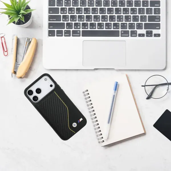 Eksklusiivne kaitseümbris M Carbon Line & Logo MagSafe kollektsioonist on kvaliteetne kate, mida toetab üks tuntumaid autotööstuse kaubamärke maailmas. See on ideaalne valik kõigile MagSafe tehnoloogiaga seadmete omanikele. M Carbon Line & Logo ümbris ühendab vastupidavuse sportliku stiiliga. Pind on kaetud ökoloogilise nahaga ja süsinikmustriga, mida täiendab kontrastne kollane joon, inspireeritud M-stiilist. Kogu ümbrist kaunistab metallist logo, mis kinnitab toote autentsust ja rõhutab selle prestiiži. Kaamera raam ja nupud on viimistletud musta värviga, andes ümbrisele elegantse ja ühtse välimuse.