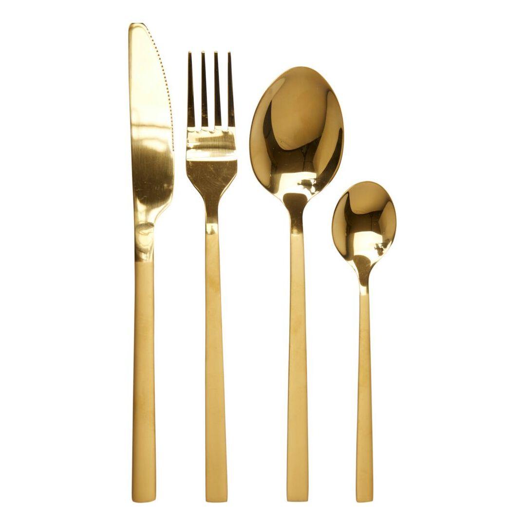 16-osaline söögiriistade komplekt. Söögiriistad on valmistatud roostevabast terasest, kuldse PVD kattega. Nõudepesumasinas pestavad. Komplektis on 4 nuga, 4 kahvlit, 4 lusikat ja 4 teelusikat.