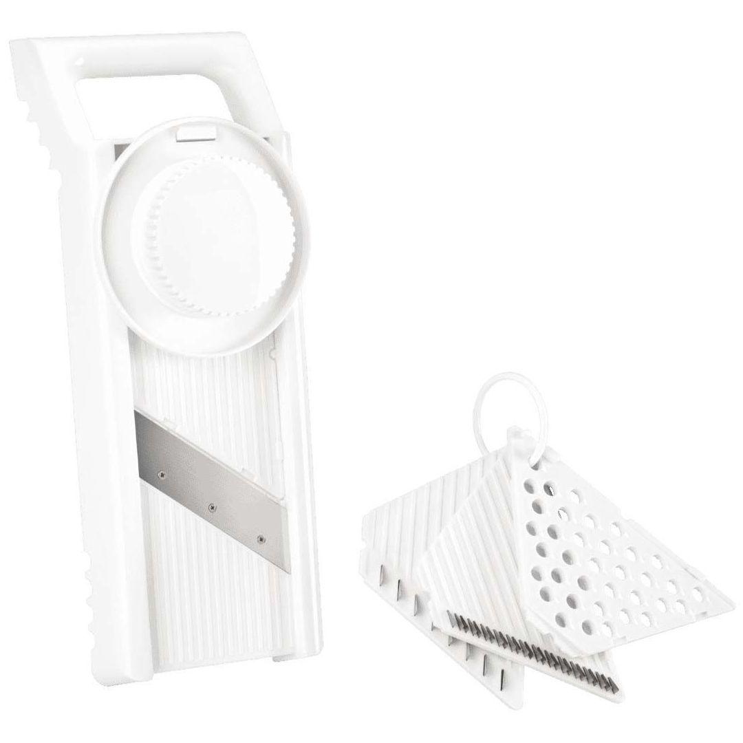 7- lõiketeraga köögivilja mandoliinriiv. Riivi terad on valmistatud roostevaba terasest. Kaasas 3 kahepoolset lõikeplaati erinevate paksustega viilude või ribade viilutamiseks. Kaasas spetsiaalne hoidik köögivilja hoidmiseks, millega köögivilja riivil ohutult libistada.