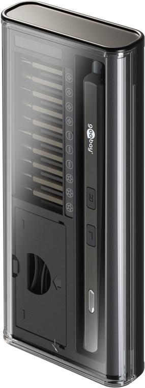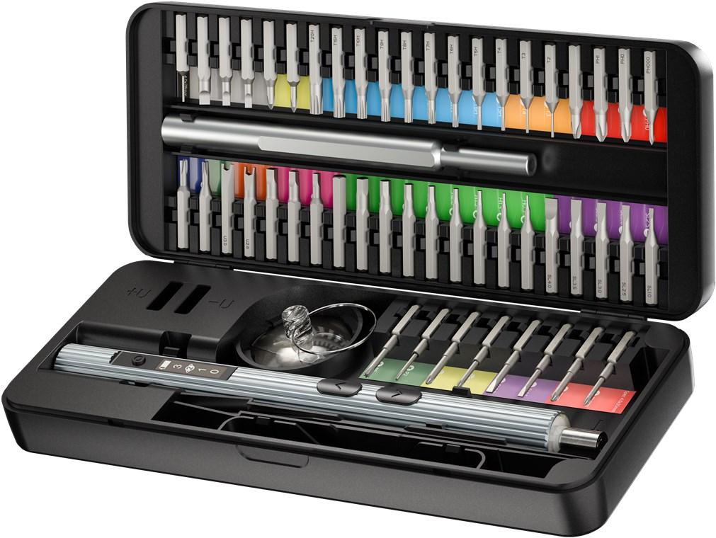 Elektriline kruvikeeraja 20 täppisotsikuga komplektis tööriistakomplekt täppiskeeramiseks, kokkupanekuks ja isetegemisprojektideks Elegantne alumiiniumdisain: Elektriline kruvikeeraja avaldab muljet oma metallilise korpuse ja mugava kasutuse poolest. Eriline omadus: karbis olevad magnetilised pesad hoiavad otsikuid kindlalt paigal. Omadused: Kompaktne kruvikeerajate komplekt kaetud alumiiniumist, läbipaistva kaanega saledas karbis Õhuke elektriline kruvikeeraja istub mugavalt käes ja tagab täpse kontrolli töödel nutiseadmete, sülearvutite, arvutite, droonide jms kallal Komplektis 20 otsikut: 3× lapik, 4× ristpea (PH), 4× Torx (T), 3× pentalobe, 2× tri-wing, 2× kolmnurkne, 2× kahar (U) Täppisotsikud läbimõõduga 4 mm ja pikkusega 28 mm, tüübimärgise ja visuaalse paigutusega parema ülevaate tagamiseks Magnetilised pesad hoiavad otsikuid kindlalt paigal ja võimaldavad neid hõlpsalt eemaldada 4 esiledi tagavad varjuta tööpiirkonna valgustuse Kahe suunaga pöörlemine ja värviline LED-riba aku laetuse näitamiseks USB-C™ laadimisühendus, kaasas 39 cm pikkune USB-C™ → USB-A laadimiskaabel
