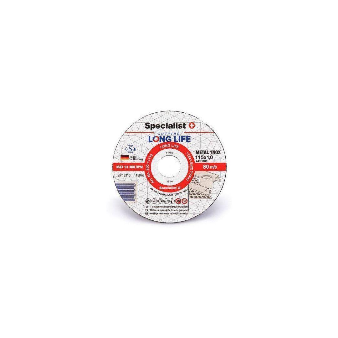 Specialist+ lõikeketas Metal/Inox 115 x 1,0 x 22 mm. Sarja Long life kettad Inox on üliefektiivsed ja turvalised. Valmistatud hoolikalt valitud kõrgeima klassi abrasiivainetest ja erilisest liimisegust ning kasutades tehnoloogiat HYDRO PROTECT, mis ei lase niiskusel ketta sisse tungida ja pikendab ketta tööiga (teadagi minetab enamik kettaid aastaga koguni 60% omadustest). Inoxi kettad sobivad erinevate metallide ja roostevaba terase lõikamiseks. Ei sisalda väävlit, rauda ega muid ühendeid, tänu millele ei kahjusta tervist ja sobib suurepäraselt roostevaba terase lõikamiseks.