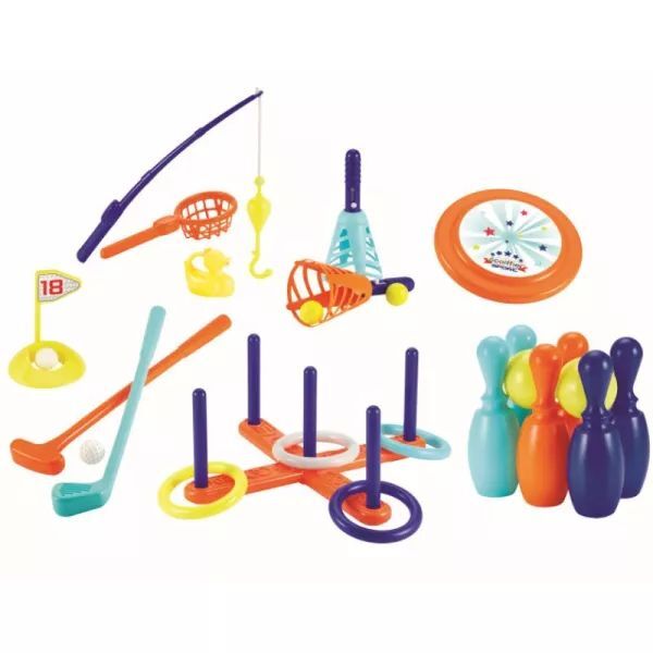 Kui ilm on ilus, suunduge õue! Pole paremat viisi, kuidas veeta lõbusat pärastlõunat aias. Écoiffier osavuse spordikomplektiga on meelelahutus garanteeritud, sest lapsed saavad valida 6 erineva spordiala vahel: Mini golf on igavene klassika. Kes suudab palli kõige vähemate löökidega auku saada? Keegel? Muidugi! Vaja on vaid horisontaalset pinda ja võid alustada veeretamisega. Rõngavise? Tundub lihtne, kuid pole kerge tabada suurimaid punkte andva rõngast. Frisbi? Vajad vaid kahte inimest ja natuke ruumi, kuid saad mängida ka koeraga. Pallipüüdja? Esmalt püüa pall kinni ja seejärel viska see edasi! Kalapüük? Järve pole isegi vaja, piisab suuremast kausist või aiabasseinist. Kõlab hästi, eks? Pärast kasutamist saab kõik tagasi toodet karpi panna, nii et kui talv juba uksele koputab, on kõik lihtsasti ja praktiliselt kevadeni hoiustatav. Toode on valmistatud kvaliteetsest ja vastupidavast plastikust, mis talub ilmastikuolusid. Pakendi suurus: 50 x 36 x 11 cm