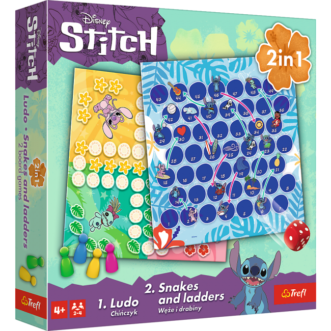 Stitch & Lilo kaks ühes põnev kogupere lauamäng Ludo ning LÕKSUD JA REDELID. LUDO ehk reis ümber maailma. Veereta täringuid ja vii kõik nupud oma koju. Võidab see, kes reisiseiklused esimesena lõpetab ja kõik nupud oma koju saab. Ole tähelepanelik, et vastane sinust mööda ei kihuta. Kellel on rohkem õnne täringuvisetes? LÕKSUD JA REDELID: Kes esimesena finišisse jõuab, on võitja. Oma teel võid kohata erinevaid lõkse, mis viivad sind mängulaual tagasi. Lõksud on märgitud punaste joontega. Roni mööda redeleid (märgitud mängulaual siniste nooltega) kaugemale ning jõua teistest kiiremini finišisse. Sobib vanusele: 4+. Mängijaid: 2–4. Mäng kestab: 10–25 min.
