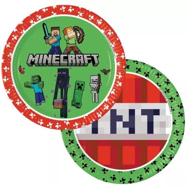Pabertaldrikute komplekt Minecrafti teemaga sünnipäeva- ja nimepäevapidudeks, temaatilisteks lõbutsemisteks populaarse videomängu, Minecrafti fännidele - et suurtel päevadel ei peaks nii palju nõusid pesema. Mõnda taldrikut kaunistavad Steve, Alex, Creeper ja Enderman, teisi aga TNT kiri. Pakendis on 8 pabertaldrikut. Materjal: 100% paber Taldrikute läbimõõt: 23 cm