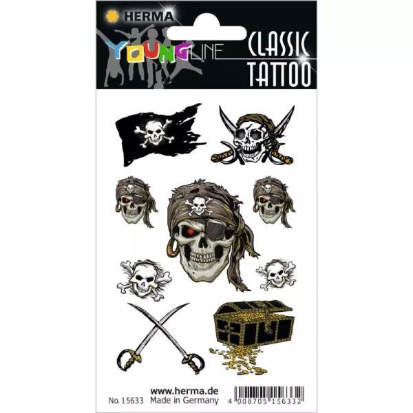 Herma piraaditeemalise mahapestava tätoveeringu komplektiga saavad lapsed kanda endal tõeliste mereröövlite väärilisi sümboleid. Kolju, lipp, mõõk, aare… Väiksed saavad valida kleepekate seast meelepärase vormi ja paigaldada selle nobedalt oma nahale. Tätoveeringud püsivad nahal 3-5 päeva, kuid nende eemaldamine on võimalik ka varem: need saab vee ja seebi abil lihtsalt maha pesta. Pakkide suurus: 16 x 9 cm