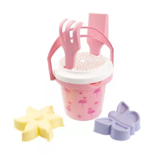 Pastellroosa liivakasti komplekt, mida saab kasutada nii aias, rannas kui ka mere ääres. Valmistatud paksust, vastupidavast plastikust. Pakendi suurus: 25 x 18 x 17 cm