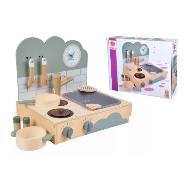 Eichhorn puuköök on täiuslik valik väikestele kokkadele, kes soovivad end köögikunstis proovile panna. See lauapealne köök on kompaktse suuruse tõttu ideaalne väiksematesse ruumidesse, pakkudes samal ajal mitmesuguste funktsioonidega täielikku kogemust. Mänguköök on varustatud interaktiivsete elementidega, mis muudavad mängu veelgi realistlikumaks. Nupud on keeratavad, ahju uks on avatav, pakkudes lastele tõelist toiduvalmistamise elamust. Köögil on sisseehitatud kraanikauss ja pliit, nii saavad väikesed õppida põhilisi köögitoiminguid. Komplekti kuulub 10 osaline lisatarvikute komplekt, mis hõlmab põhiköögitarbeid, et lapsed saaksid kohe alustamiseks. Põhijooned: - Interaktiivsed elemendid: Mänguköök on varustatud helifunktsioonidega, mis muudavad mängukogemuse veelgi realistlikumaks. Nupud on keeratavad, ahju uks avatud. - Sisseehitatud kraanikauss ja pliit: Köök sisaldab kraanikaussi ja pliiti, et väikesed saaksid õppida põhilisi köögitoiminguid. - Lisatarvikud: Komplekt sisaldab 10 lisatarvikut, millest leiate põhiköögitarbed. Mõõtmed: 43 x 35 x 31 cm