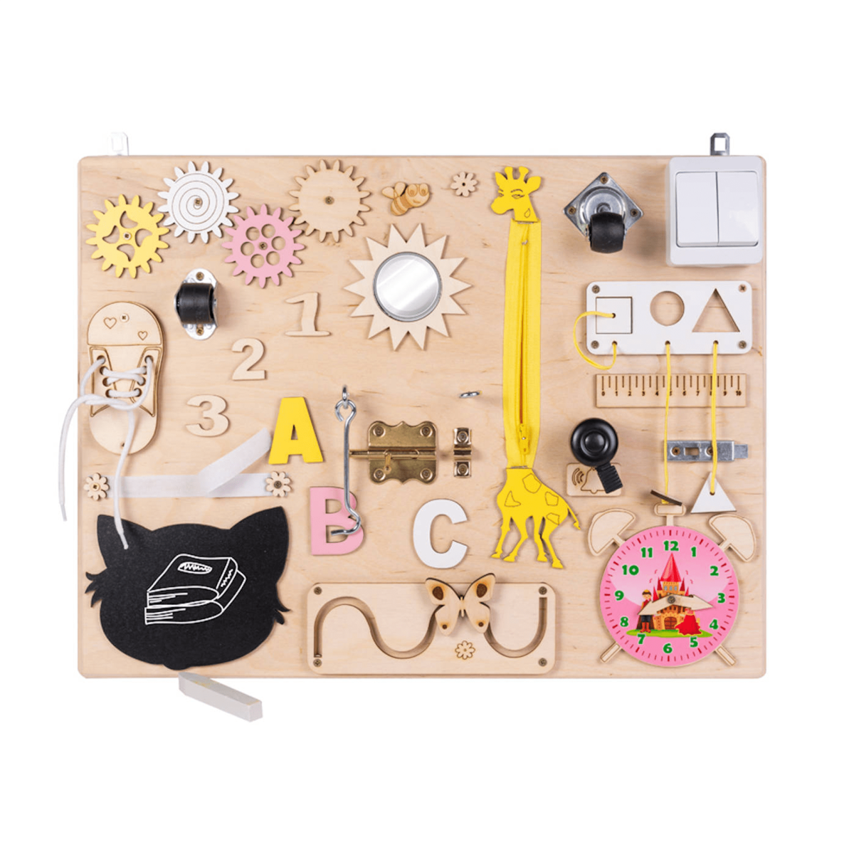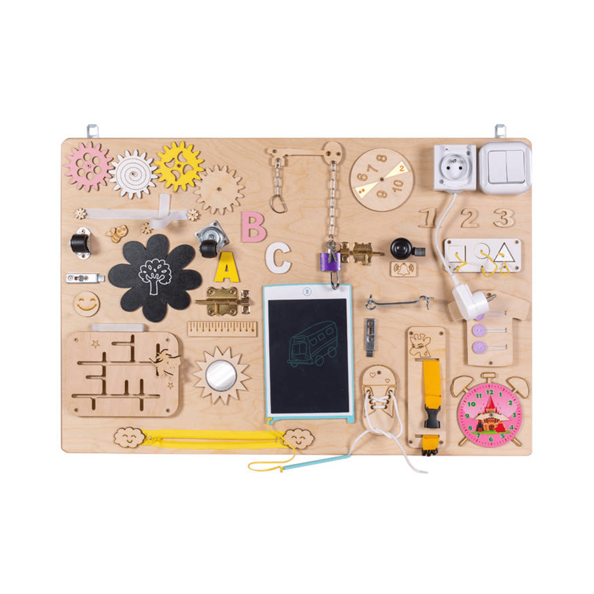 Kõige lõbusam viis maailma tundma õppida on mängude kaudu. "Montessori-inspireeritud tahvel on suurepärane võimalus aidata lastel arendada paremini põhilisi meeli, julgustada eneseväljendust ja loovust ning õppida läbi mängu.See aitab lastel arendada loovust, iseseisvust, käelist osavust ja loogilist mõtlemist, samuti numbrite ja kujude äratundmist, meelte arengut: nägemine, kuulmine, puudutus, assotsiatsioon, vaatlus, ajataju, mälu, püsivus, keskendumisvõime ja palju muud. Väikelastele meeldivad eriti peenmotoorika oskused, mida tahvel õpetab. Nende elementide abil õpivad lapsed mõistma erinevaid kujundeid ja pindu, proovivad ja õpivad erinevaid tehnikaid paelte sidumiseks ja lahti sidumiseks, õpivad tundma numbreid, mõistavad, kuidas kellamärkide töö käib ja palju muud.Tahvli komponendid: Mitmevärvilised pöörlevad hammasrattad tõmblukk elektrooniline tahvelarvuti koos pliiatsiga jalgrattakell 4 tüüpi lukustid pitsidega kinga puust figuurid mitmevärvilised puust tähed pöörlevad rattad kleeplint - kleebis liikuva nõiaga labürint geeli kujuline kriiditahvel päikesekujuline purunematu peegel pöörlevate näitajatega kell 3 kujuga sorteerija joonlaud valguslüliti smiley lukk koos võtmetega pöörlev ring numbritega pistikupesa T-särk nuppudega pandlaga vöö kaasas on konksud tahvli riputamiseksMõõtmed: 75 x 50 cm