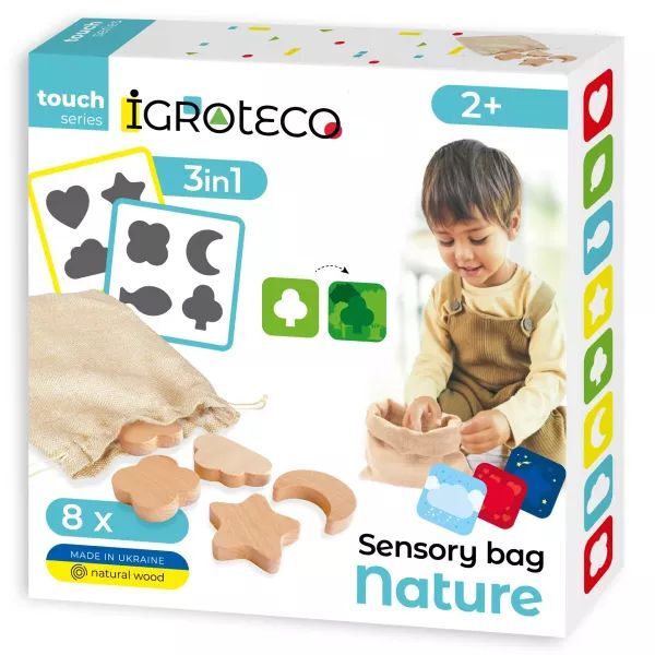 Avasta looduse imesid 3-in-1 sensoorse komplektiga! Mängu eesmärk on, et lapsed saaksid oma meeleelundite kaudu õppida tundma erinevaid kujundeid, arendades samal ajal oma loogilist mõtlemist ja mälu. Komplekt on ainulaadne, kuna lapsed saavad figuure valida ka suletud silmadega, arendades seeläbi oma kompimismeelt. Mängu saab mängida 6 erineval moel: Valige figuur kotist välja vaatamata. Täiskasvanu nimetab figuuri, laps otsib selle välja. Klassikaline lotomäng. Tasakaalumäng. Paaritage värvilised kaardid antud kontuuriga figuuriga. Pange kaardid erinevasse järjekorda ja võtke need siis välja. Toote omadused: Kõrgekvaliteedilised, 100% puidust figuurid Lastele ohutu lakk Arendav mäng, mis pöörab suurt tähelepanu detailidele Ökoloogiliselt jätkusuutlikud materjalid Keskkonnasõbralik pappkarp Komplekti sisu: 8 tükki puidust figuuri ohutu lakiga 8 kahepoolset kaarti, kontrastsete kujundite ja värviliste piltidega 4 kahepoolset lotokaarti Linane kott tõmbekinnitusega Pakendi suurus: 5 x 18 x 18 cm