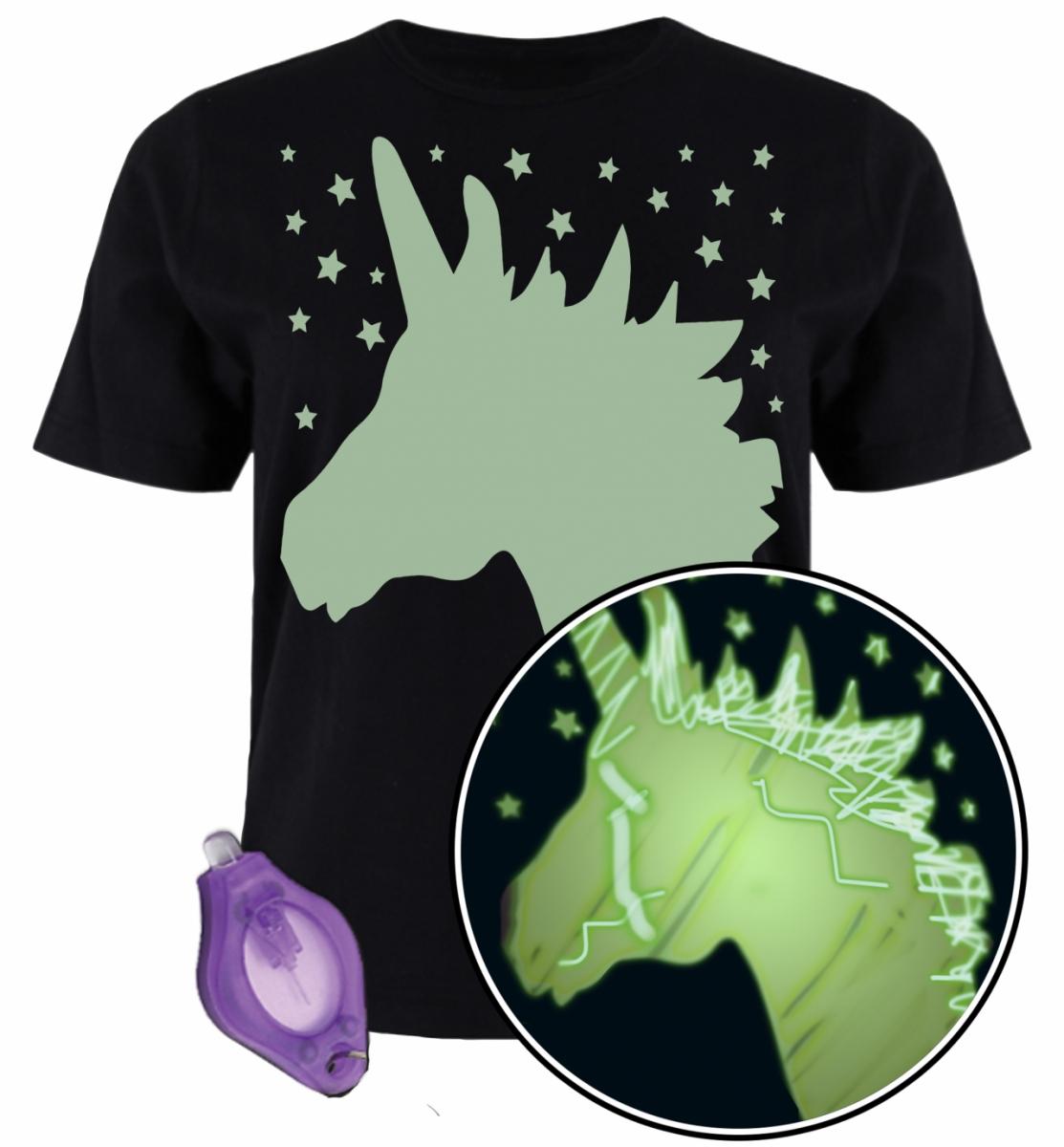 SPLAT PLANET laste t-särk, mis helendab pimedas - Ükssarvik.Toote omadused:T-särgi valge pilt helendab pimedas peale valges olemist.Komplekti kuulub helendav pliiats-taskulamp.Vajutades pliiats-taskulambile, lülitub sisse valgus, millega saab joonistada t-särgile pildi. Pilt on nähtav pimedas. Kui pilt kaob, saab selle uuesti joonistada. Lisaks saab joonistamiseks kasutada laservalgust, telefoni või teisi valgusseadmeid.Pesta 30° juures.Koostis: 100% puuvill.Sobib lastele vanuses 9 kuni 11 eluaastat.