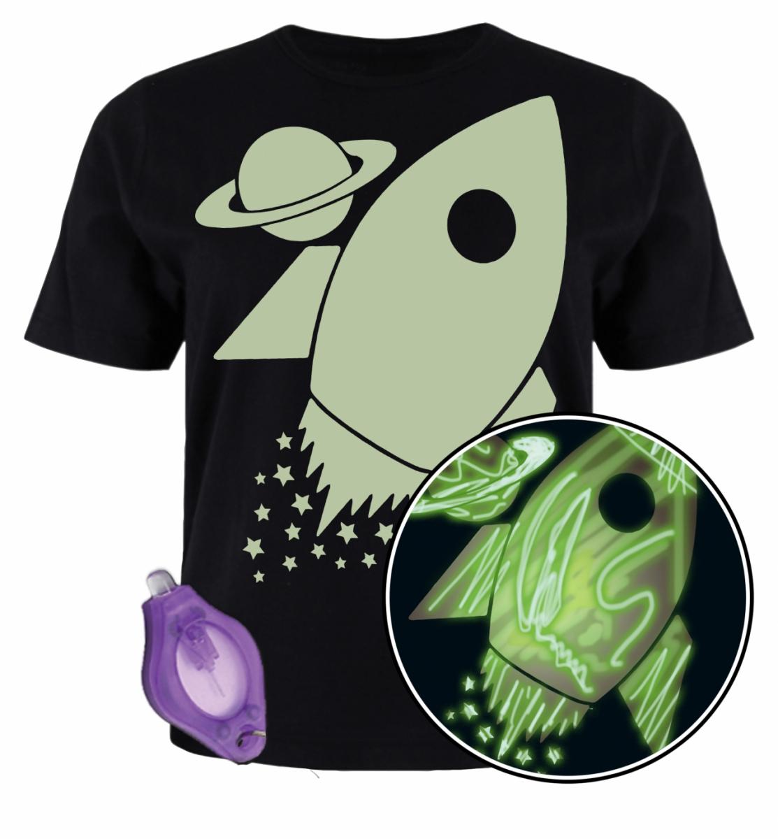 SPLAT PLANET laste t-särk, mis helendab pimedas - Kosmos.Toote omadused:T-särgi valge pilt helendab pimedas peale valges olemist.Komplekti kuulub helendav pliiats-taskulamp.Vajutades pliiats-taskulambile, lülitub sisse valgus, millega saab joonistada t-särgile pildi. Pilt on nähtav pimedas. Kui pilt kaob, saab selle uuesti joonistada. Lisaks saab joonistamiseks kasutada laservalgust, telefoni või teisi valgusseadmeid.Pesta 30° juures.Koostis: 100% puuvill.Sobib lastele vanuses 12 kuni 13 eluaastat.