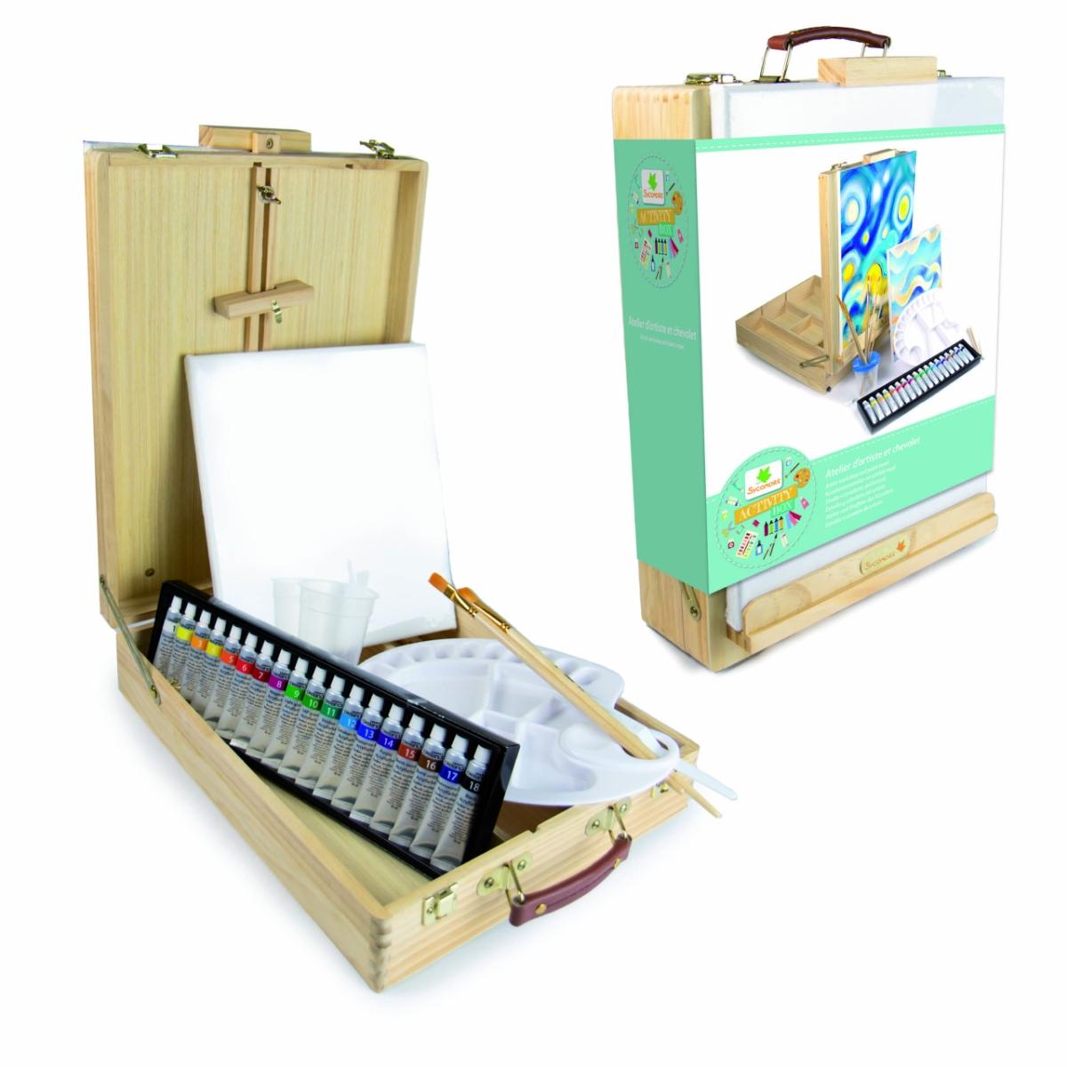 SYCOMORE uhke kunstikomplekt kastiga.Toote omadused:Eriti suur kunstnikukomplekt kauni puidust molbertiga ja koguni 52 tarvikuga.Komplektis: 18 tuubi akrüülvärvi; 10 kvaliteetset pintslit (suurus 4-22); 2 pliiatsit 2B; 1 suur palett; 1 spaatel; 2 x 8 lõuendiklambrit; 2 lõuendit (30x40 cm ja 25x30 cm).Kohvri mõõdud: 33 x 13 x 45 cmMolberti kõrgus on reguleeritav kuni 70 cm