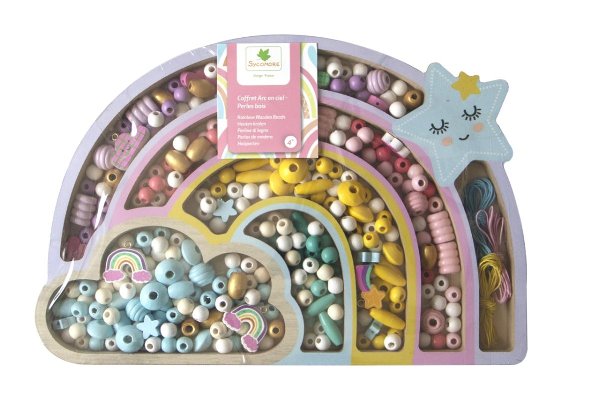 SYCOMORE puidust helmeste komplekt Vikerkaar.Toote omadused:Originaalne vikerkaarekujuline karp kaunite pastelsetes toonides helmestega.Komplekt võimaldab luua palju kauneid ehteid: kaelakeesid, käevõrusid jne.Komplektis on 3 meetrit traati ja palju helmeid kenas karbis.Mõõdud: 20 x 30 x 3 cm