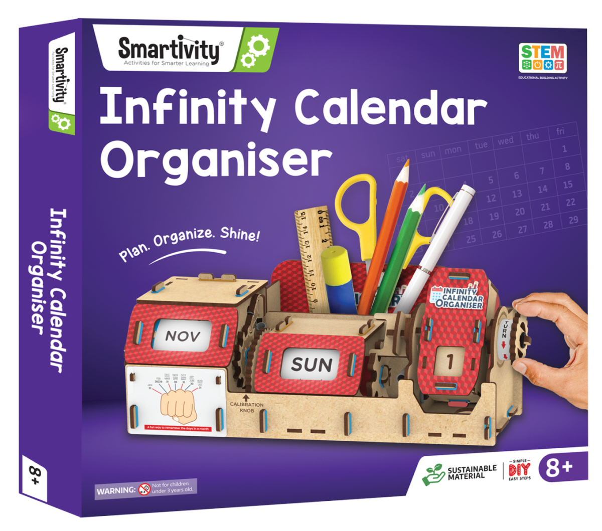 Asendage oma lapse lihtne kalender selle laheda seadmega, mille nad ise ehitavad.Toote omadused:Tutvustab lastele mehaanika põhitõdesid, julgustades neid uurima selliseid kontseptsioone nagu Geneva, Ratchet ja Pawl and Drop Cam mehhanismid.See isetegemise kalender ei aita mitte ainult aega planeerida, vaid mahutab ka kirjatarbed, seega on see komplekt väga praktiline.Pole mingit segadust, kuna kokkupanek ei vaja liimi ega tööriistu.Arendab lapse loovust, peenmotoorikat, annab enesekindlust.Lihtne kokku panna, lahti võtta ja uuesti kokku panna, järgides vanusele vastavaid juhiseid.Täielik komplekt: 2 puitlehte osadega; 1 sünteetiline leht osadega; 1 värviline puitleht osadega; 54 lahtist osa; üksikasjalikud juhised.Toode on inglise keeles.