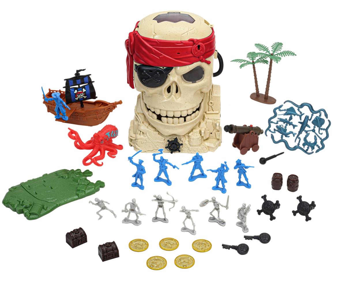 Suur piraadikomplekt, millel on hirmutav kolju ja palju tarvikuid.Omadused:Komplektis on suur pealuu ja palju tarvikuid, nagu piraadilaev, palmid, ragulka, võtmed, laekad, mündid, tünnid, palju sõdurifiguure ja palju muud.Kokku sisaldab komplekt 45 tarvikut.