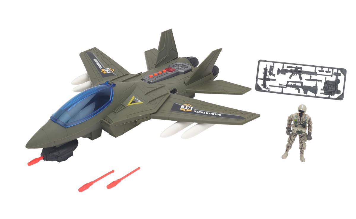 Suur sõjaväekomplekt koos tulistamisfunktsiooniga.Omadused:Võimas hävitaja heli ja valgusega.Komplekti kuuluvad hävitaja, kaks laskemoona, sõdurifiguur ja tarvikud.Vajab kolme LR44 patareid (kaasas).