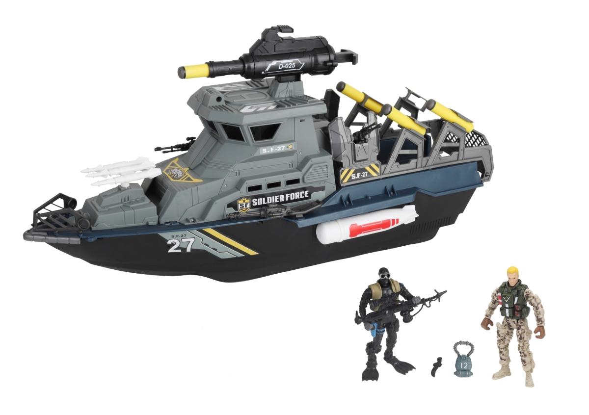SOLDIER FORCE Naval Combat Battleship komplekt, mis võimaldab tulistada rakette ja kaitsta oma laeva.Toote omadused:Laeval on eemaldatav raketiheitja.Komplekti kuulub 1 lahingulaev, 1 raketiheitja, 2 sõduri märulifiguuri ja tarvikuid.