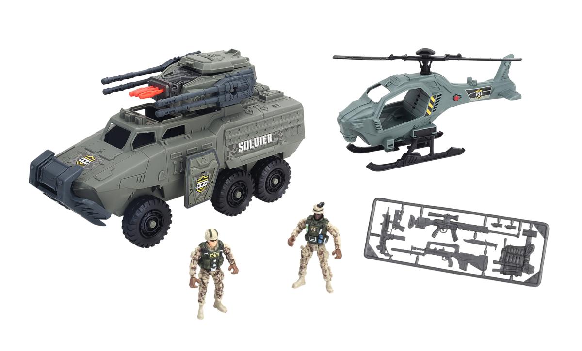 Suur sõjaväekomplekt koos tulistamisfunktsiooniga.Omadused:Heli ja valgusega komplekt.Komplekti kuuluvad sõjaväesõiduk, helikopter, laskemoon, sõdurifiguurid ja tarvikud.Vajab kahte LR44 patareid (kaasas).