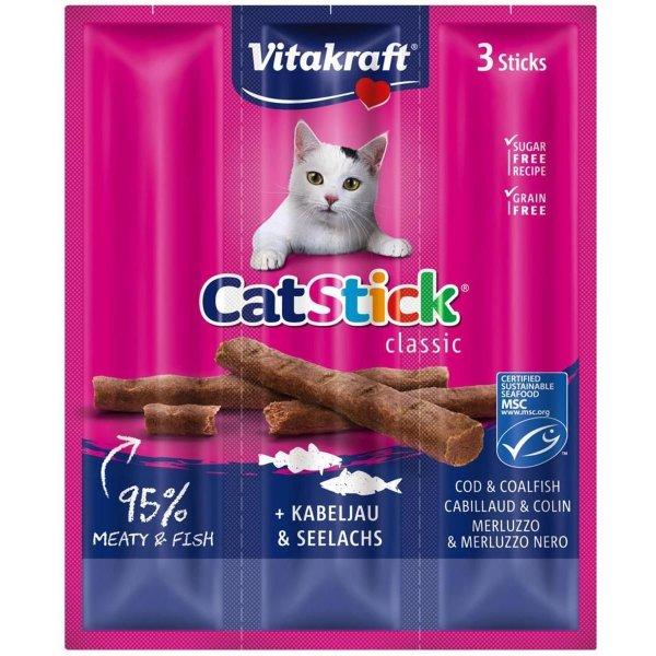 Vitakraft Cat Stick Mini - spetsiaalselt kassidele loodud maiustus tursa ja tuunikalaga.See on suurepärane valik, kui tahate hellitada enda kodulooma põhitoidukordade vahel. Maiustus on mõeldud kassidele alates 1 kuni 7 eluaastani.Maitsestatud tursa ja tuunikalaga - pulgad suurepärase aroomi ja maitsega.Valkudega, mis annavad kassile energiat ja mängulisust.Vitamiinide ja mineraalidega, mis tugevdavad looma immuunsüsteemi.Ilma kunstlike värvainete ja maitsetugevdajateta.Pakendis - 3 tk.Anda maiusena. Ei asenda põhisööta. Tootja: Vitakraft, Saksamaa.Koostis: liha ja loomsed kõrvaltooted (83%, millest 75% lihaskude), kala ja kalast saadud kõrvaltooted (tursk 6%, põhjaatlandi süsikas 6%), mineraalained.Söödalisandid/1kg: toitainelised lisandid: vit. A (3a672a) - 5000 RÜ, vit. D3 (E671) - 500 RÜ. Antioksüdantide ja säilitusainetega.Analüütilised koostisosad: toorvalk - 33,5%, toorõlid ja -rasvad - 20%, toorkiud - 2%, toortuhk - 10%, niiskus - 28%.Toitmine: anda kassile 1-2 tükki päevas. Hoida kuivas ja jahedas kohas.