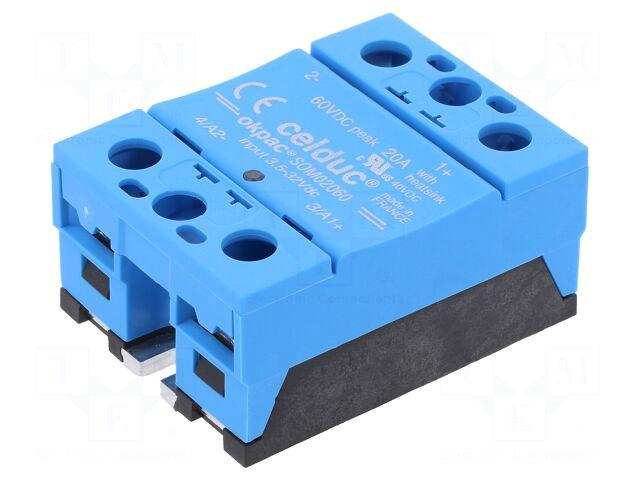 SOM02060 on kompaktne ja usaldusväärne pooljuhtlülitusseade (SSR), mis on mõeldud kuni 20A erinevate alalisvoolu koormuste tõhusaks ja kaitstud lülitamiseks. See alalisvoolu väljundiga SSR kasutab MOSFET-tehnoloogiat, mis pakub traditsiooniliste triakil põhinevate releedega võrreldes kiiremaid lülituskiirusi ja väiksemat energiatarbimist. Integreeritud TVS-diood pakub transientse pinge summutust väljundile, parandades relee vastupidavust pingeliste kõikumistega keskkondades.Peamised omadused:Käitleb laia valikut alalisvoolu koormusi kuni 20A-ni, kasutades vastupidavat MOSFET-tehnoloogiatLai juhtpinge vahemik (3.5-32VDC) ühilduvuse jaoks erinevate juhtimissüsteemidegaIntegreeritud TVS-diood transientse pinge summutuseks ja täiustatud väljundi kaitseksKruviklemmid turvaliste ja usaldusväärsete ühenduste jaoksNõuetekohaseks soojuse hajumiseks on vaja eraldi jahutit (ei kuulu komplekti)Vastab peamistele rahvusvahelistele ohutusstandarditele (CE, EAC, UKCA, UL)Rakendused:Tööstusautomatika ja juhtimissüsteemidAlalisvoolu seadmete toitehaldusAlalisvoolu mootorite ja solenoidide lülitamineLED-valgustussüsteemide juhtimineJa paljud muud alalisvoolu koormuse rakendused...Märkus: Jahuti ei kuulu komplekti ja tuleb osta eraldi.