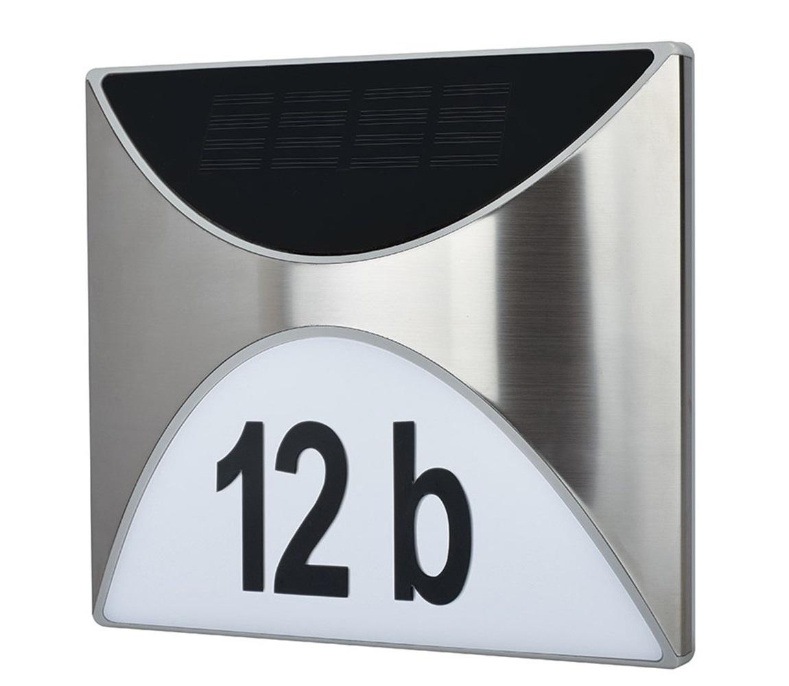 Valgustatud majanumber päikesetehnoloogiaga.LED dioodide arv: 3.Lamp on valmistatud metallist ja plastikust.Komplektis on hämarusandur - lülitub automaatselt sisse pärast pimeduse saabumist.Akud: 2x1,2 V HR6 (AA, NiMH).Laadimisaeg: 6-8 h.Valguse kestus kuni 8 h.Isekleepuvad numbrid ja tähed (a, b, c, d, e, f) kuuluvad komplekti.