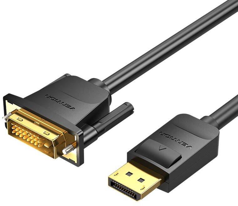 DisplayPort to DVI 2m cable Vention HAFBH (Black)The Vention brand cable will meet your expectations when connecting video devices. One of its key advantages is the gold-plated contacts of the connector. They provide excellent signal conductivity, so you can be sure that the image displayed on your monitor or TV will be sharp and interference-free.Excellent image qualityThe DisplayPort to DVI connector makes it ideal for connecting a laptop or desktop computer to a monitor or TV. The cable supports DisplayPort version 1.2, which means the maximum resolution is 1920 x 1080 pixels at a smooth 60 Hz refresh rate. If you're interested in 1080p video modes and 3D functionality, this cable will also support them. Enjoy high-quality images during your favorite audiovisual entertainment!Robust constructionThe use of copper conductor guarantees a stable signal connection with no loss of quality. What's more, the cable is magnetically shielded, which provides protection against electromagnetic interference. This means that you will enjoy a clear picture without flicker or noise. The Vention cable is also a plug and play product, so you don't have to worry about complicated configurations - just plug it in and enjoy excellent picture quality.ManufacturerVentionModelHAFBHCable length2 mConnector 1DisplayPort maleConnector 2DVI maleDisplayPort version1.2Maximum resolution1920 x 1080 pixelsSupported video modes1080pMaximum refresh rate60 Hz3DYesColorBlackConductor materialCopperPropertiesMagnetically shieldedChipsetPS8121EShielding materialPolyvinyl chloride (PVC)Plug and PlayYes