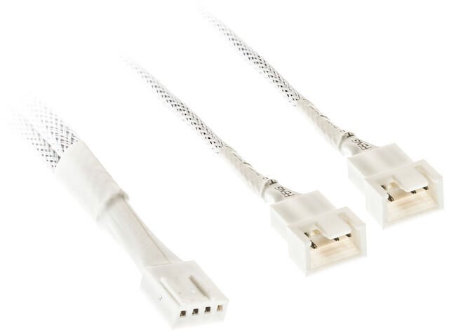 The Kolink 1-2 PWM fan splitter cable allows you to connect up to two PWM fans to a single PWM fan header on the motherboard and control them synchronously. Since the fans are PWM controlled, the speed of each fan changes depending on the CPU temperature and/or the BIOS settings of the motherboard. This means that the fan speed and thus the noise level are reduced when the system does not require high airflow. The cable is braided, enhancing the appearance of your cable management.