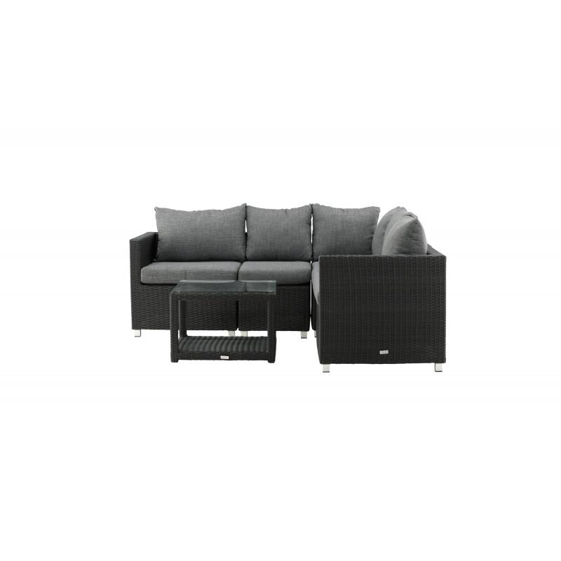 Moodne disain diivanigrupp teie siseõuele või terrassile. Diivanigrupp koosneb nelja istmega modulaarsest nurgadiivanist ja nurgaosast, mida on lihtne vastavalt oma vajadustele kombineerida. Sealhulgas tumehallid pehmed padjad, samuti alumine kohvilaud reljeefse riiuli ja klaasplaadiga. Valmistatud metallraamist ja mustast kunstrotangist.