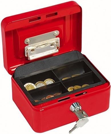 Rahakarp / kassa / miniseif WEDO klambriga (NR 1) 145 102H - PUNANE Mõõdud 15,2x11,5x8cm, nelja vahega sisu, kaane küljes (seespool) sularahaklamber. Rahakarp on valmistatud tugevast metallist ning on lukustatav (2 võtit komplektis, võtme nr. võtmeluku peal). Kassal on käepide mugavaks kaasas kandmiseks. Sees on must plastikust mündialus (mündialuse kood on karbi sildil). Mündialuse saab karbist lihtsalt välja võtta. Mündialuse all saab hoida paberraha. Kaasaskantavat rahakarpi saab kasutada sularahaga arveldamisel näiteks erinevatel väliüritustel, pidustustel, kontserditel, kohvikutes, kiirtoiduautodes, piletite müügil, laatadel, messidel või kodus rahakassana / kaasaskantava miniseifina. Kui kassa sisu eemaldada sobib ka erinevate esemete kindlaks transpordiks. Saadaval on suur valik erinevates suurustes, värvustes, kujudes ja erinevate sisudega rahakarpe.
