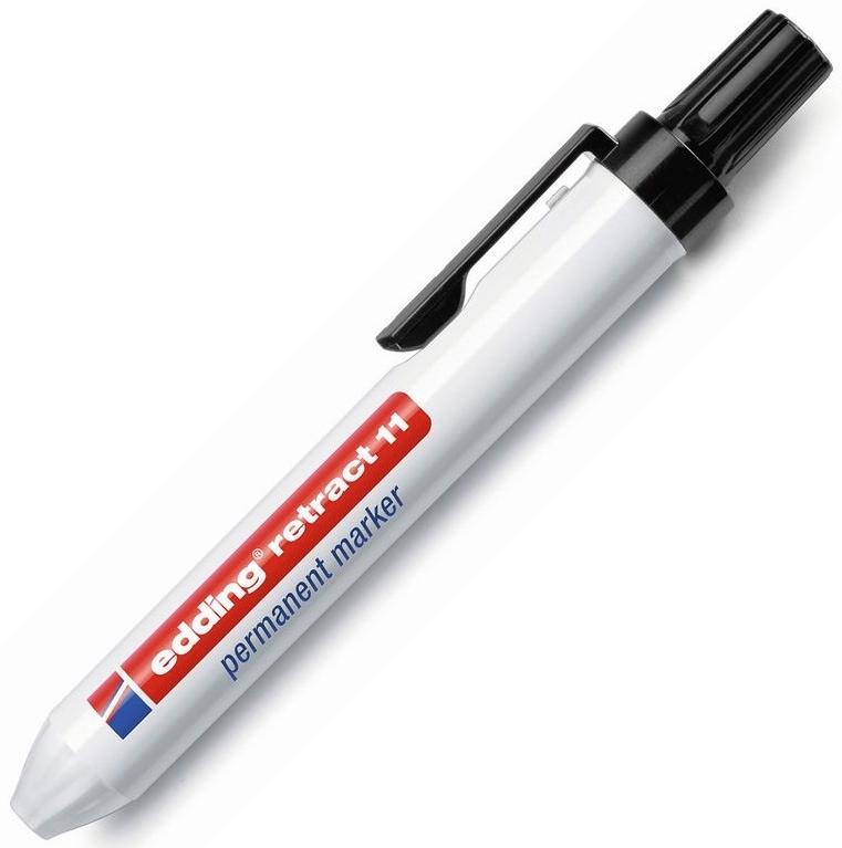 Edding 11 - klõpsuga marker Veekindel marker sobib klaasile, metallile, puidule ja plastikule. Kork ei kao enam kunagi ära - nupuvajutusmehhanism sobib ka ühe käega kasutamiseks. Välja lülitatud olekus hoiab tihend ära markeri kuivamise. Marker on ümara otsaga, joone laius 1,5-3mm.