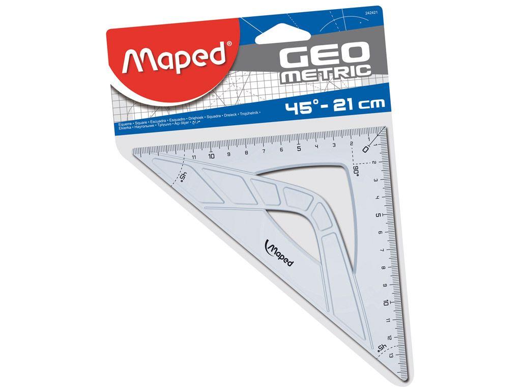 Kolmnurk Maped Geometric - 45 kraadi, läbipaistev, 21cm pikkune Kolmnurkjoonlaud Maped Geometric on ergonoomilise ja tehnilise disainiga. Paremas nurgas paiknev 0-punkt võimaldab samal ajal mõõta ja joonestada. Kõrgekvaliteedilise märgistusega skaala on eriti hea vastupidavuse tagamiseks trükitud UV-tindiga.