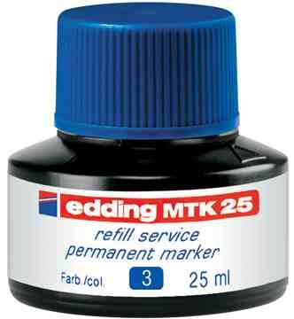 Edding MTK25 - täitetint permanentsetele markeritele E300, E330, E370, E400, E2000 ja E2200 Täitmiseks aseta marker otsikuga täitetindi pudelisse ja jäta sinna vähemalt tunniks, ideaalis terveks ööks. Marker imab ise tindi sisse. Pudelis 25ml, saab täita mitu korda. Toodetud Saksamaal