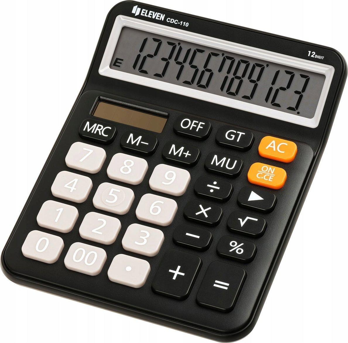 Kalkulaator Eleven CDC-110 must 12-kohaline ekraan 4-klahviline mälu: MC, MR, M+, M- Protsendid [%] Viimase üksuse kustutamine Ruutjuur [√] Topelt null [00] Kokku [GT] Mõõdud: 125 x 160 x 28 mm Topelt toiteallikas: Päikesepatarei + patarei Kaal: 141 g
