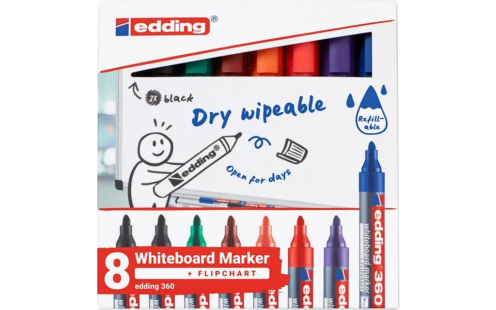 Tahvlimarkerite / paberimarkerite Edding 360 komplekt -7 värvi kaks ühes markerid kirjutamiseks valgetahvlile ja loengutahvlile / paberiplokile komplektis on 2xmust, punane, sinine, roheline, oranž, pruun ja lilla marker Pärast pingelist koosolekut või kiirustades töölt lahkudes võib juhtuda, et tahvlimarkeri korki ununeb lauaservale, mitte ei lähe tagasi oma kohale markeri otsa. Edding 360 tahvlimarkeriga pole vaja selle pärast muretseda - marker võib mitu pärva ilma korgita laual vedeleda ilma, et see ära kuivaks (testitud ISO554 standardile vastavust). See tahvlimakrer kirjutab suurepäraselt ka teistele siledatele, mittepoorsetele pindadele nagu email, klaas või melamiin. Sobib ka keraamilise pinnaga tahvlitele. Markeriga saab kirjutada ka paberiplokile, kartmata, et see lehtedest läbi imbuks. Sellel on ümmargune otsik, millega saab tõmmata 1,5-3mm laiust joont. Markeri tint on on kiiresti kuivav ja valguskindel ning samas kõigilt mitteporosetelt pindadelt lihtsalt kuiva lapiga mahapühitav. Tahvlimarker on tugevas plastikust korpuses. Markeril on praktiline kork, mis ei veere kaldus pinnalt maha ja mida saab kinnitada näiteks riiete külge. See saksamaal valmistatud nutikas marker on mugav ja usaldusväärne töövahend kõigile, kes teevad palju esitlusi ja kasutavad pidevalt valgetahvleid / loengutahvleid. Markerit saab täita, selleks sobib Eddingu valgetahvli tint Edding BTK25. Markeri töökindluse ja pikaealisuse tagamiseks tuleb seda hoiustada horisontaalses asendis. Eddingu tahvlimakrereid on saadaval erinevates värvides ja erinevate otsikutega. Edding 361 - 1mm ümara otsikuga Edding 360 - 1,5-3mm ümara otsikuga Edding 12 - 1,5-3mm ümara otsikuga, klõpsuga (mitte korgiga) Edding 363 - 1-5mm lõigatud otsikuga Edding 725 - 2-5mm lõigatud otsikuga, neoonvärvid (valgetahvlile ja klaastahvlile) Valikus on ka erineva suurusega tahvlimarkerite komplektid.