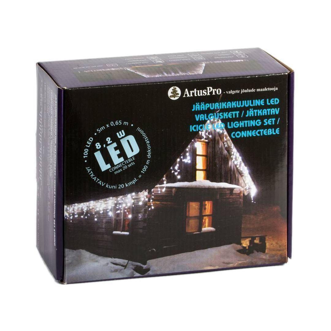 Jääpurikakujuline 100 kuldse ja sooja valge + valge LEDiga valguskett valgel kaablil. Valgusketi pikkus on 5 meetrit, koosneb kahest 2,5m lülist. Valgusketti saab jätkata kuni 25 komplekti, toitejuhe on kaasas. Valguskett sobib kasutamiseks välistingimustes: hoonete räästad ja katuse servad.