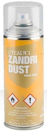 Zandri Dust Spray is designed for basecoating all Citadel miniatures. When sprayed over an undercoat, it's a fast way to get a uniform base of colour onto your models. The colour in this spray is exactly the same as Citadel Base: Zandri Dust, so if any part of the model gets missed when spraying, a quick tidy up with the equivalent paint will provide a complete basecoat. This can contains 400ml of Zandri Dust Spray.