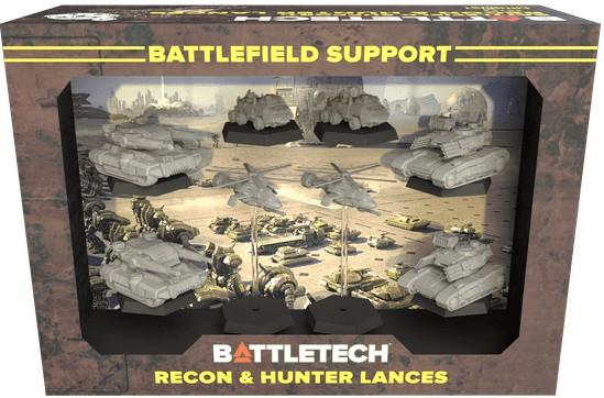 Battlefield Support Recon & Hunter The BattleTech Battlefield Support: Recon & Hunter is a collection of eight plastic miniatures for use in the classic BattleTech tabletop and Alpha Strike games. The box also provides eight dry-erase cards, which are intended to directly support Alpha Strike gameplay, and eight battlefield support Cards. Contains Eight plastic miniatures:2 Wheeled Scout Tank Skulker2 Attack Helicopter Warrior2 Heavy Tank Behemoth2 Heavy Tank Ontos Miniatures are supplied unpainted. Minimal assembly may be required.