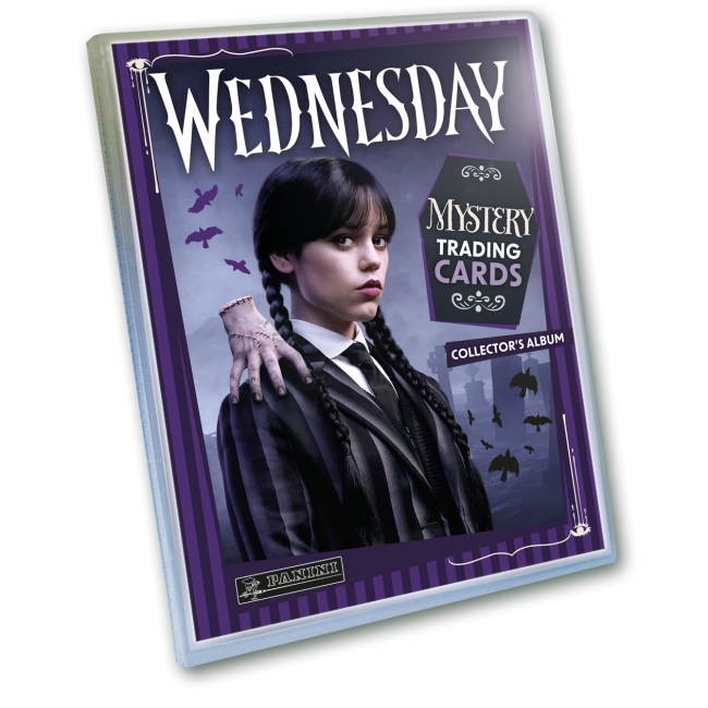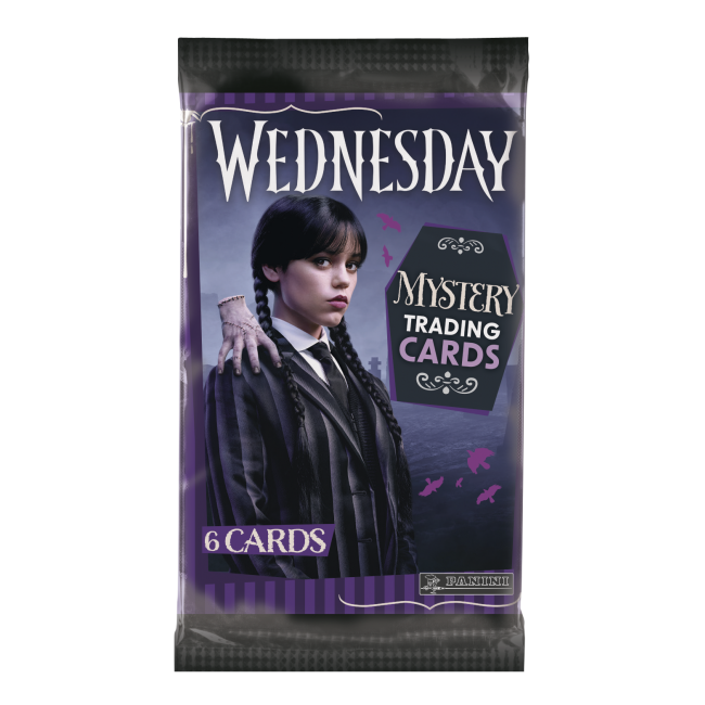 Sukeldu Wednesday maailma, kus salapära on kõikjal ja asjad on rohkem kui nad paistavad! Kogudes kõik kaardid kaustikku, avastad salajased sümbolid ja salajase sõnumi! Täis spetsiaalseid materjale (holo, pimedas helendav, peegelfoolium ja soojuse mõjul ilmuv) SPETSIALNE MATERJAL JA SISU Spetsiaalsed holo kaardid, tumedad, kuid säravad! Spetsiaalsed säravad kaardid 1 PEEGEL paralleelversioon. Spetsiaalne pimedas helendav tint. Milline lause ilmub? Spetsiaalne soojuse mõjul nähtav tint. Avasta peidetud sümbol. ERILISED PUZZLE-KAARDID 9 kaardi kokku panemisel (1 kaustiku lehekülg) ilmub salapärane pilt! ERILINE MÄNG „GUESS WHO?” Arva, kes on tegelane, lähedalt vaadeldava detaili järgi tagaküljel! Booster-pakett sisaldab 6 kaarti. Koguda on 180 kaarti.