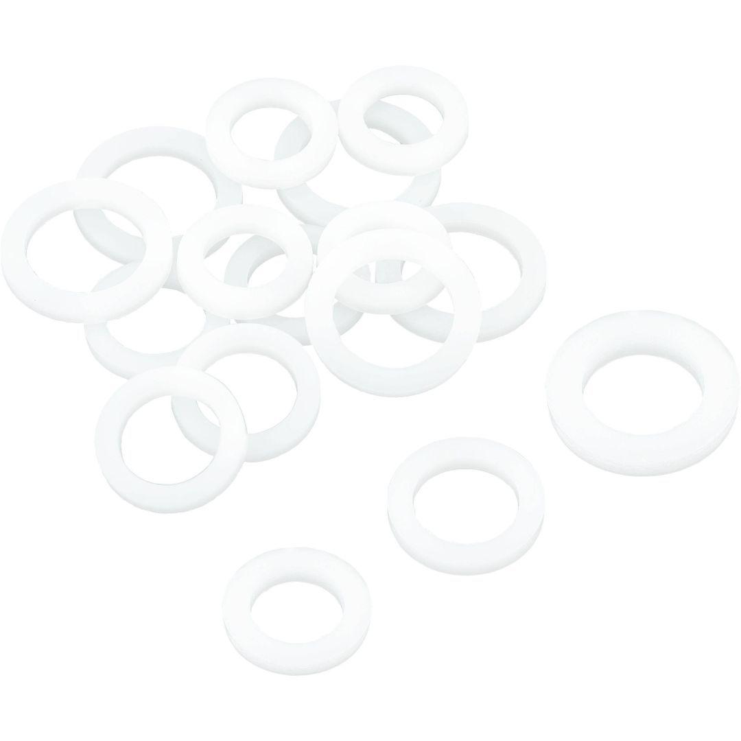Suki plastikust seibide komplekt, kuhu kuuluvad seibid Ø9/15, Ø10/16, Ø11/17, Ø12/18, Ø13/19 mm, valget värvi (18 tk).