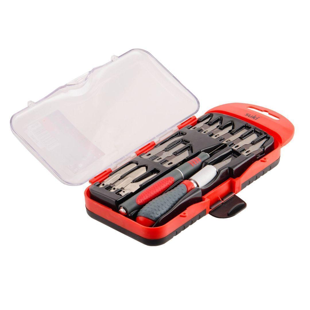 14-osaline Suki nugade komplekt. Noad on mõeldud kasutamiseks puutöödel. Noad on varustatud ergnonoomilise käepidemega. Komplektis on kaks nuga ja 12 erineva profiiliga laba.