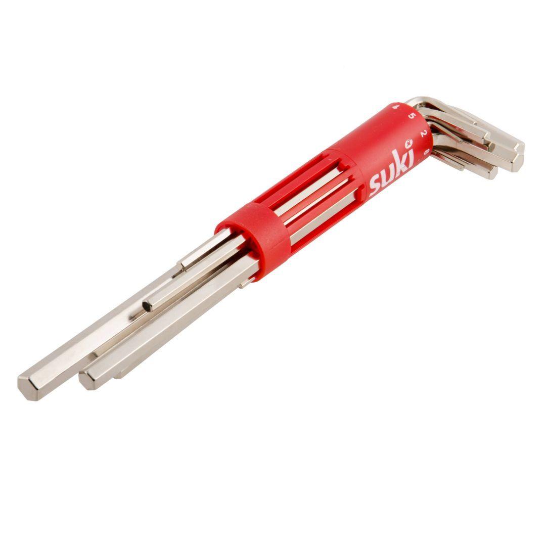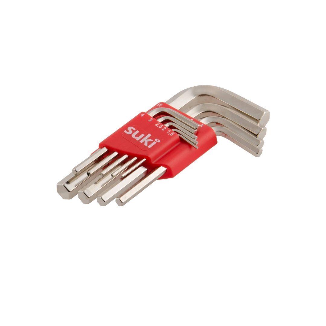 Suki 9-osaline kuuskantvõtmete komplekt 1,5 - 10 mm, lühike versioon. Plastikust hoidjaga. Valmistatud kroom-vanaadium terasest. Kuuskantvõtmed on karastatud ja nikkel viimistlusega. Kuuskantvõtmete vastavusstandard on DIN ISO 2936.