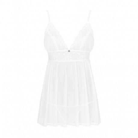 Valge läbipaistev võrk baski, millel on aluskorviga tassid ja sobivad G-stringid. Rihmad, ripatsid ja konks ja silmad seljas on reguleeritavad. Ilma sukkadeta. Materjal: baski - 94% polüamiid, 6% elastaan; string - 90% polüamiid, 10% elastaan. Pesu käsitsi, maksimaalne temperatuur 30 °C.