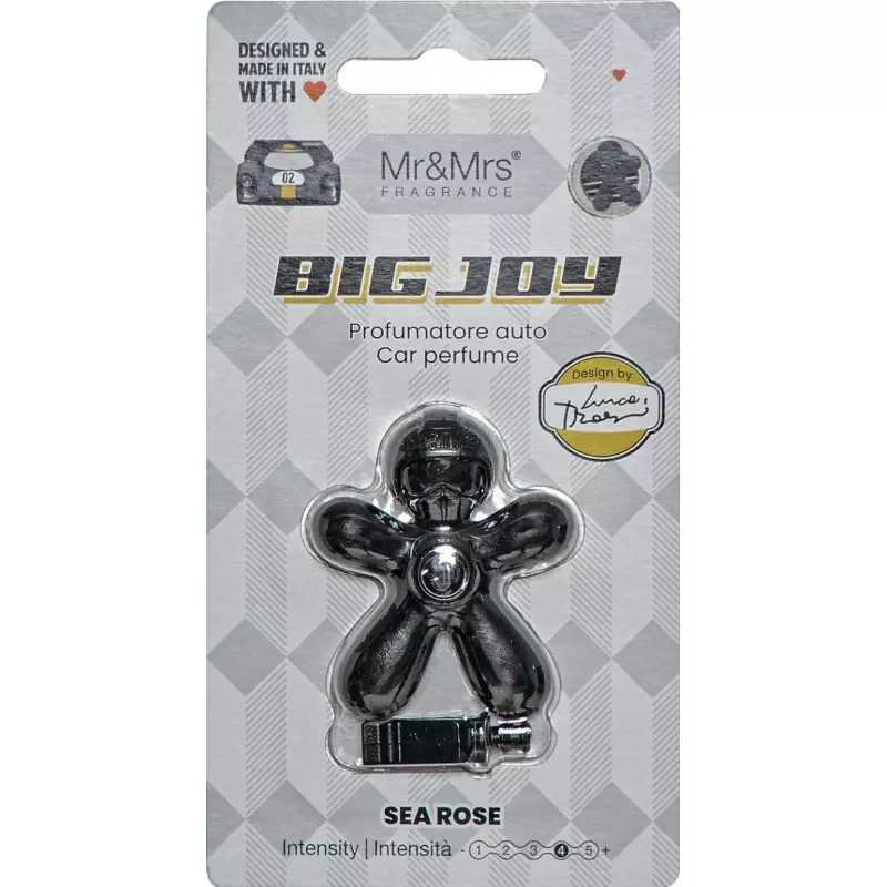 MEREROOS Värske, mereauto lõhn. Lõhna säilitamiseks kasutatakse spetsiaalset valemit, mis hoiab lõhna ERITI kaua. Stiilne BIG JOY mees on suurepärane reisikaaslane. Valmistatud EVA termoplastilisest polümeerist – pehmest kummist. Kui see puutub kokku ventilatsiooniavade õhuvooluga, eritab see meeldivat lõhna. Mittetoksiline. Sisaldab desodoreerivat valemit. Disain: Luca Trazzi. Tehtud Itaalias. Aroom koosneb puuvilja-, puidu- ja veeaktsentidest. Sidrunheina, roosa pipra, virsiku, roosi, meresoola, vanilli, merevaigu, seedri nootides. Lõhna intensiivsust reguleeritakse õhuvoolu ja soojuse abil. Jääb +/- 30 päeva. Lõhnaperekond: värske, mereline. Tipunoodid: Keskmised noodid: Alus: Värv must.