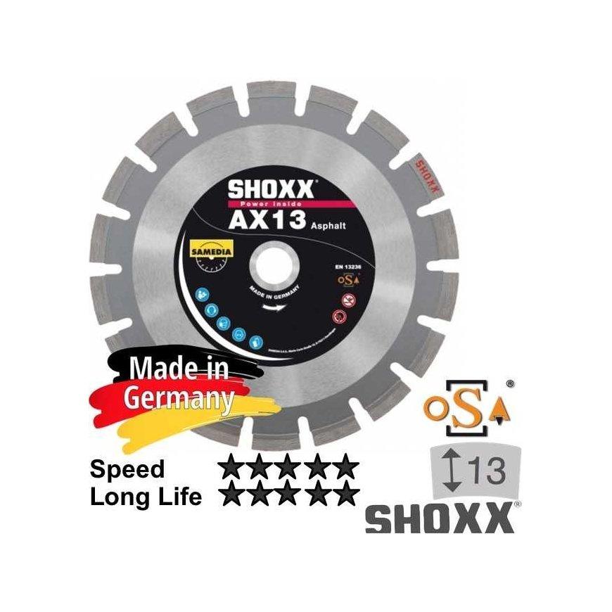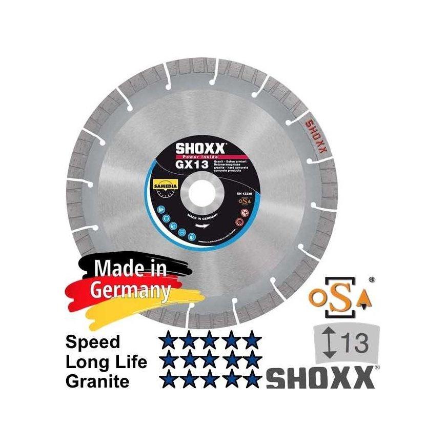Eelised: • SHOXX tehnoloogia segment • Lõikab kiiremini • Vähem vibratsiooni • Turvalisem • Pikem kasutusiga • Laserfikseeritud segment SHOXX tehnoloogiaga, purunematu. • Valmistatud Saksamaal Lisainformatsioon: • 13 mm kõrgune teemantsegment pikaks kasutamiseks. • 25,4 mm läbimõõduga auk paigaldamiseks. • Sobib märjaks ja kuivaks kasutamiseks. Tööriista kasutatakse: • Abrasiivsete materjalide jaoks • Asfaldile