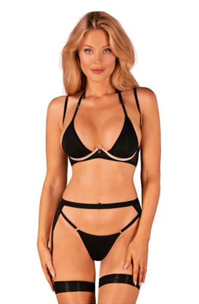 Obsessive Selinne mustast pesukomplekt sukahoidjaga - XS/S Selinne pesukomplekt on kõike muud kui peen, kutsudes teid avastama oma sensuaalsust stiilselt. See must läbipaistmatu komplekt sisaldab poolkaelarihma ja trikoodiga rinnahoidjat, kahe rihmaga sukkpüksivööd ja sobivat G-stringi. Rinnahoidja tassid on esile tõstetud roosakas kuldses toonis, õlarihmad jätkuvad mõlemalt poolt ülespoole. Nii rinnahoidjal kui ka rihmavööl on reguleeritavad rihmad ja konks ja silmad seljas. Ilma sukkadeta. Kangas: 85% polüamiid, 15% elastaan. Pesu käsitsi, maksimaalne temperatuur 30 °C. | 2 | 28,17 € | Vaata | ||