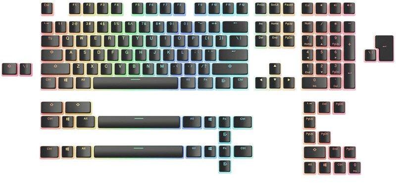 Komplettes Keycap-Set in Schwarz, für US-Tastenlayout (ANSI), mit 145 Tastenkappen aus PBT-Kunststoff, lichtdurchlässig beschriftet, für Cherry MX und baugleiche Switches, verschieden breite Sondertasten inklusive