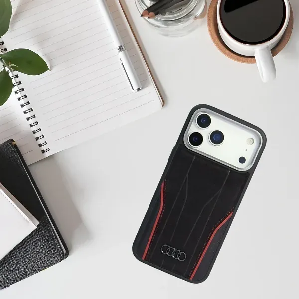 Audi R8 ehtsast nahast seeria on loodud neile, kes otsivad sportliku elegantsi ja kõrgeima kvaliteediga käsitööd. Ümbris on valmistatud naturaalnahast koos luksusliku Alcantara® materjaliga. Must viimistlus punaste õmblustega rõhutab R8 seeria dünaamilist iseloomu ja annab aksessuaarile ainulaadse stiili. Iga ümbris on käsitsi viimistletud, tagades unikaalse iseloomu. Naturaalne nahk koos Alcantara®-ga annab pehme puudutusega pinna ja elegantse välimuse. Välimust täiendavad hõbedased külgnupud, hõbedane kaamera raam ja tagasi diskreetselt paigutatud must logo.
