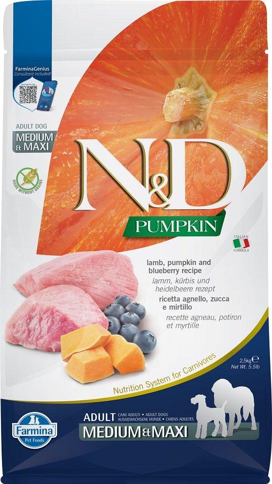 Farmina N&D Grain Free Pumpkin Lambaliha ja mustikas täiskasvanud keskmise suurusega ja Maxi 2,5 kg